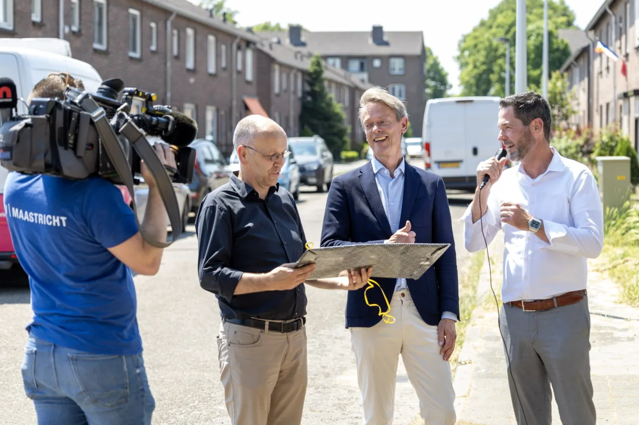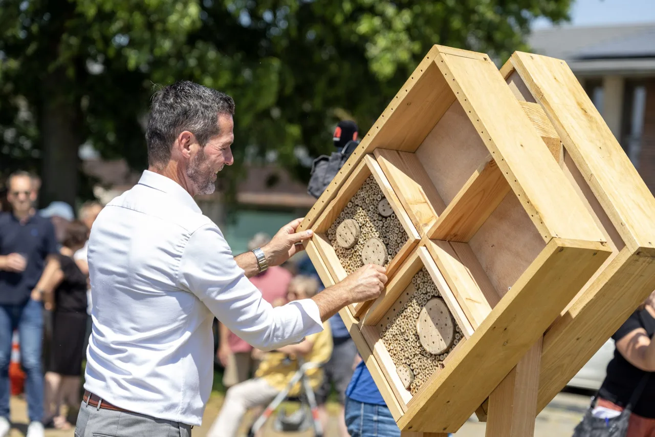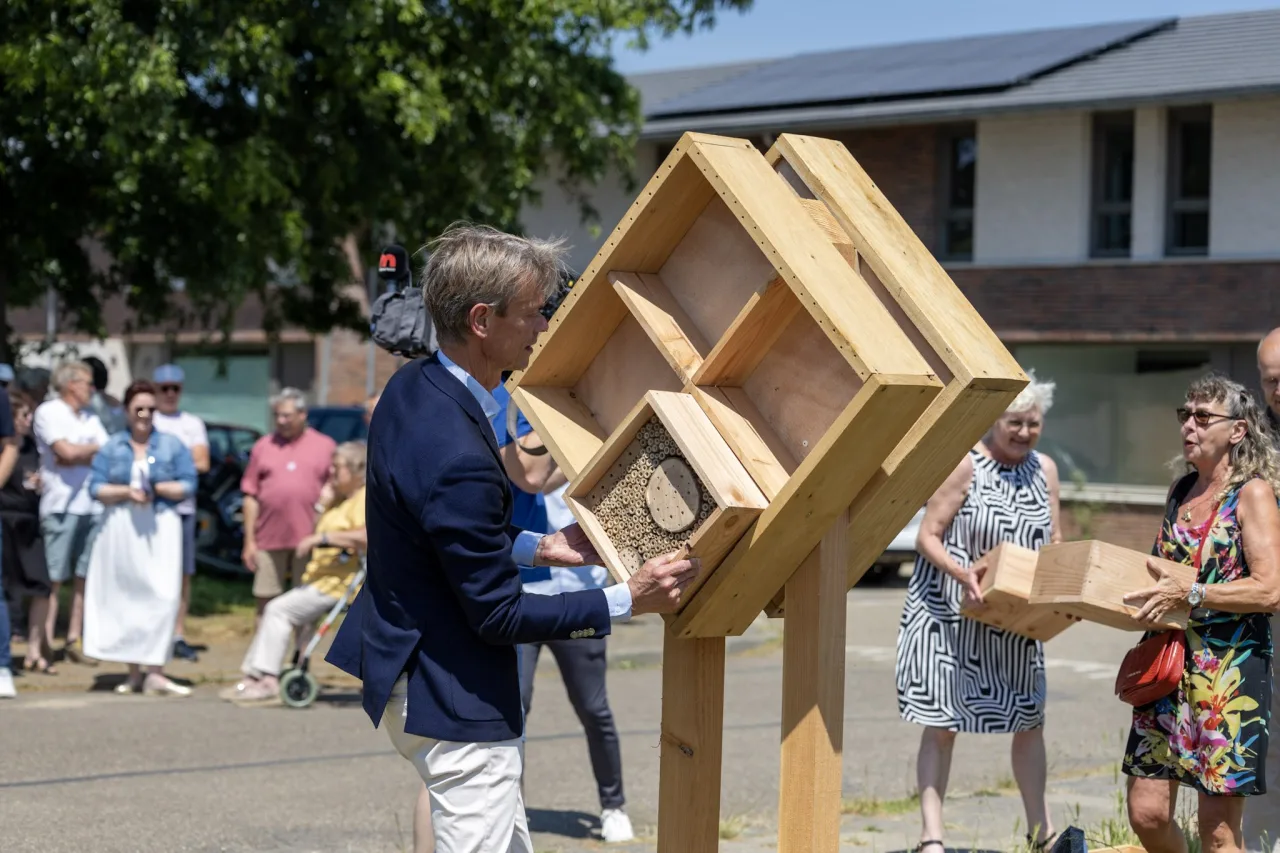 Met de onthulling van een bijenhotel, werd vrijdag 9 juni in de wijk Nazareth stilgestaan bij de oplevering van 28 levensloopbestendige nieuwbouwwoningen en de start van de renovatie van 91 woningen. Van Heur Bouw & Onderhoud realiseerde de nieuwbouwwoningen en gaat aan de slag met de grootschalige renovatie, in opdracht van Woonpunt. Aan Wim Hazeu (bestuurder Woonpunt), Frans Bastiaens (wethouder stedelijke ontwikkeling), vertegenwoordigers van de Bewoners Overleg Commissie en Marc Pluijmakers (directeur Van Heur Bouw & Onderhoud) de eer om het bijenhotel te vullen met insectenkasten.